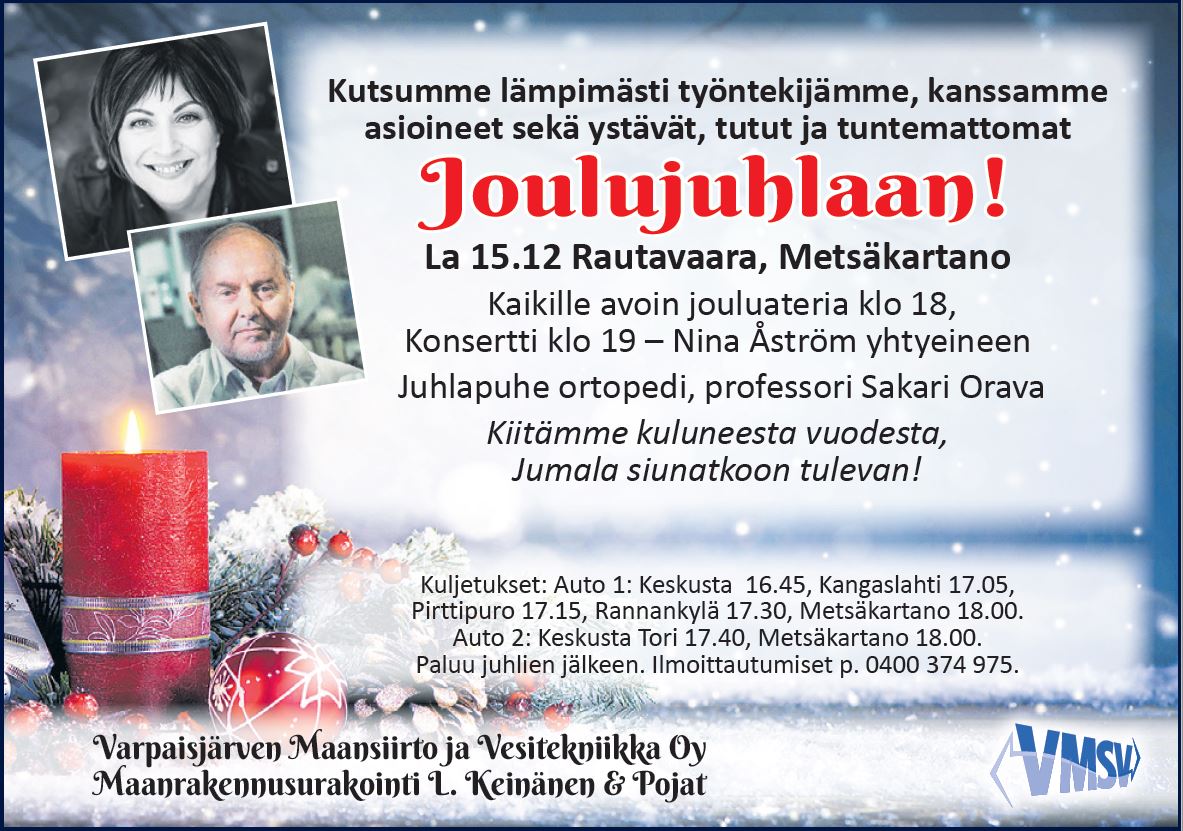 Joulujuhlaa vietetään 15.12.2018 Rautavaaran Metsäkartanolla.
